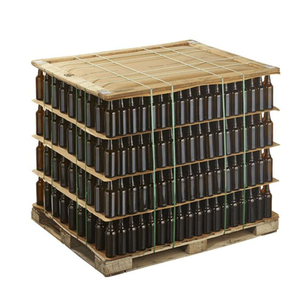 Our popular 22 oz standard bomber bottles feature a traditional style amber glass construction that is typical of many popular beer bottles. Similar in style to the traditional 12 oz long neck bottle but in a larger size, the 22 oz standard bomber bottle is perfect for sharing. The dark amber color of the glass reduces UV light, a contributing factor of spoilage. Packaged in bulk with 1260 bottles divided between 4 layers stacked on each pallet. Each layer is divided by heavy duty cardboard and secured with a hardwood top frame. We also use additional supports that are put in place to protect the glass when shipping to avoid any damage. Our long neck 22 oz bomber bottles are compatible with standard 26mm crown cap pry-off closures (sold separately).